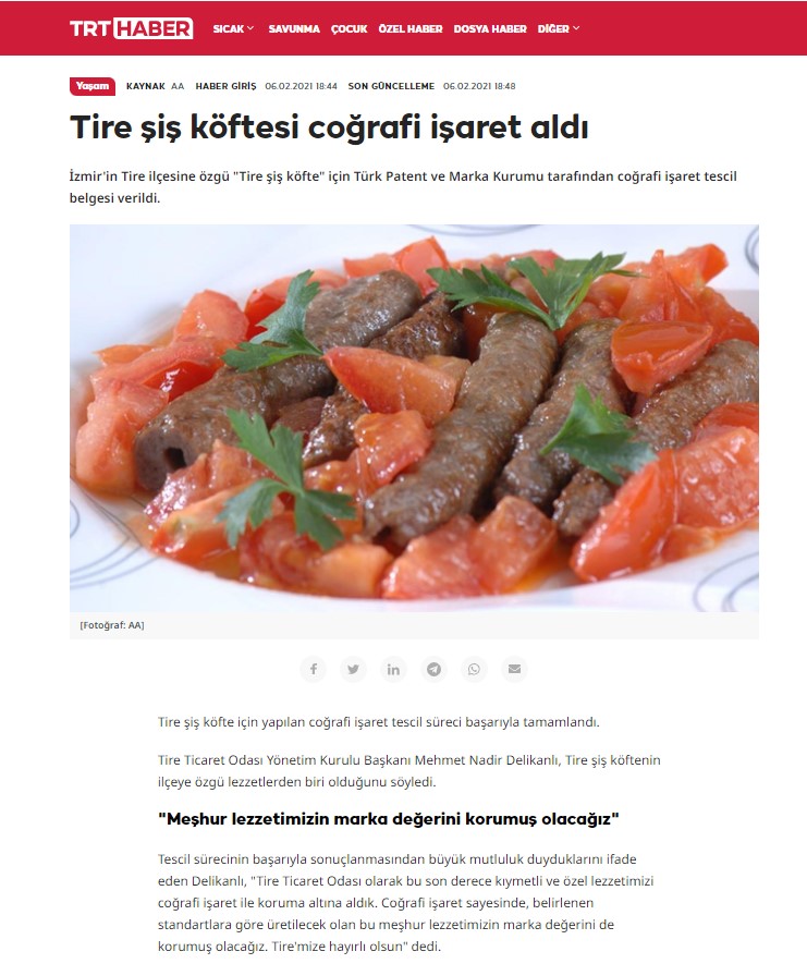 TRT Haber 06.02.2021 tarihli “Tire Şiş Köfte Coğrafi İşaret Aldı” Haberi